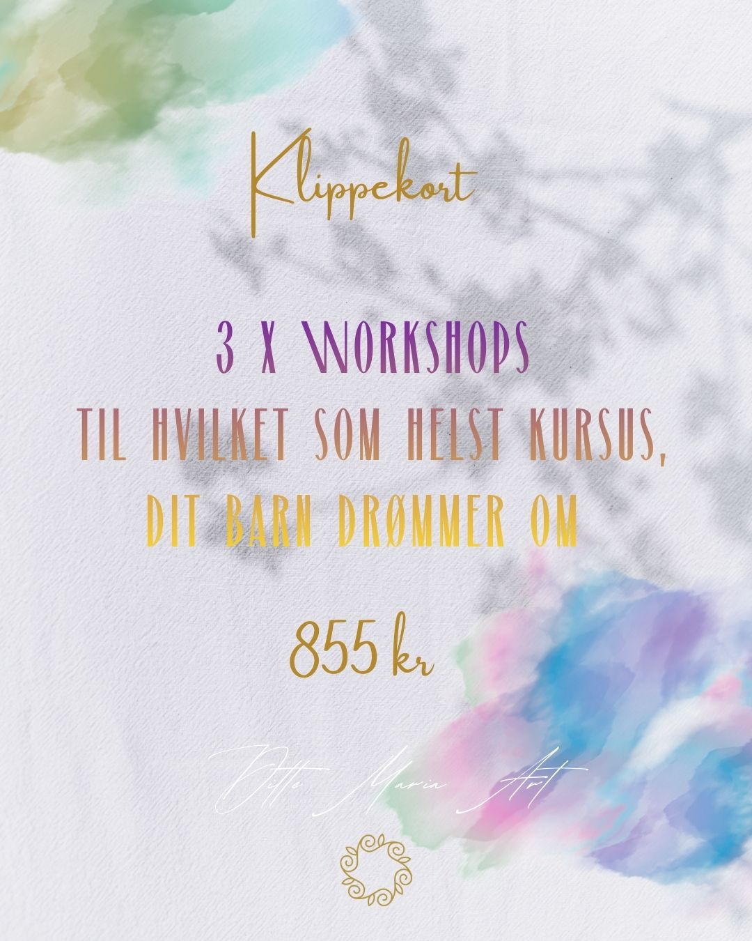 Ved køb af klippekort får man fri adgang til alle mine workshops, inden for den respektive aldersgruppe – tilmelding til de enkelte workshops foregår via e-mail.